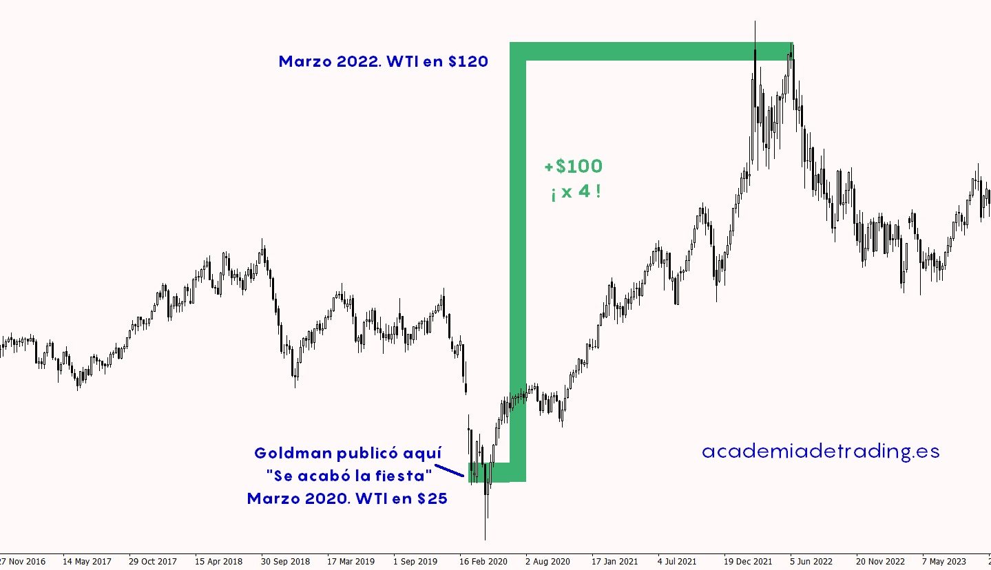Te muestro a continuación el petróleo justo cuando Goldman decía que «Se acabó la fiesta»: