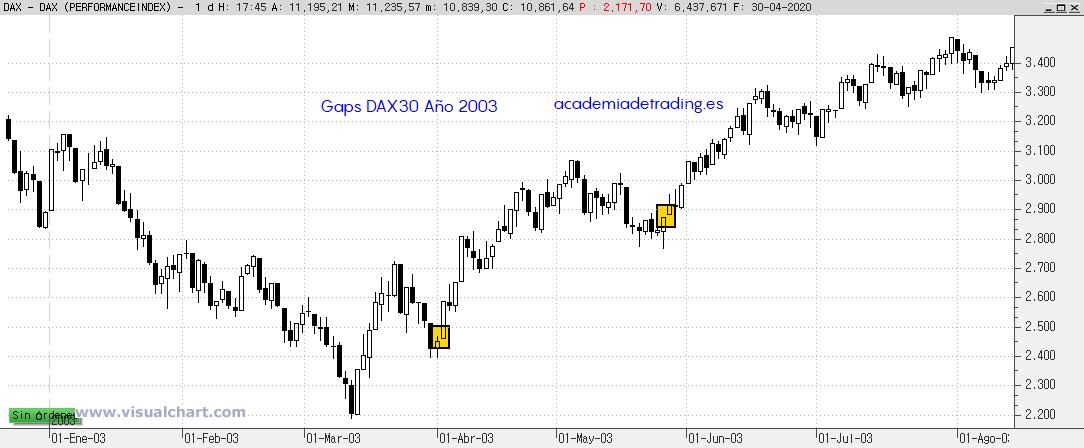 Gaps que sucedieron en Abril y Junio de 2003 en el DAX. Nunca se cerraron, y nunca se cerrarán