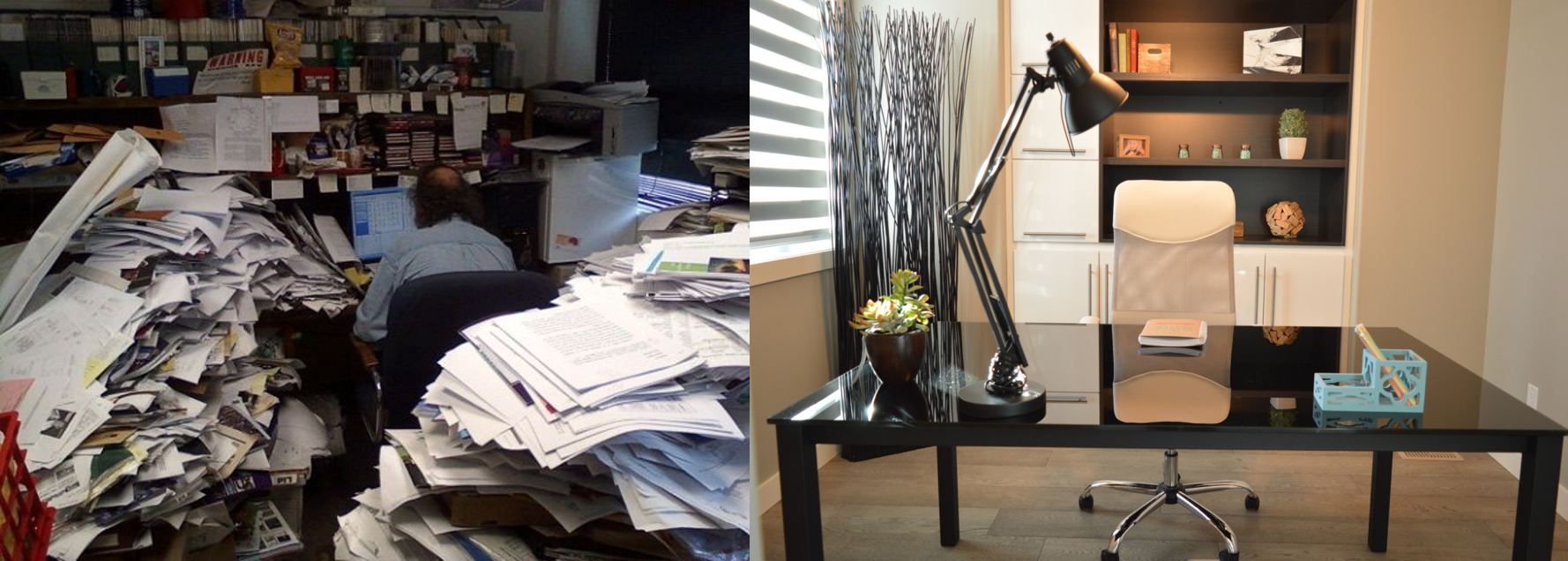 Después, pasados los años, sí que me di cuenta de la importancia que tiene trabajar y vivir en un sitio aseado. Más que nada porque cuando a mi alrededor todo guarda cierto orden, creo mejores artículos, se me vienen a la cabeza mejores ideas para esta academia, y las ejecuto de forma más brillante. Y si no crees que tu espacio de trabajo sea importante para determinar qué resultados vas a obtener, contéstame con sinceridad en cuál de las dos oficinas que te presento a continuación te sentirías más a gusto: