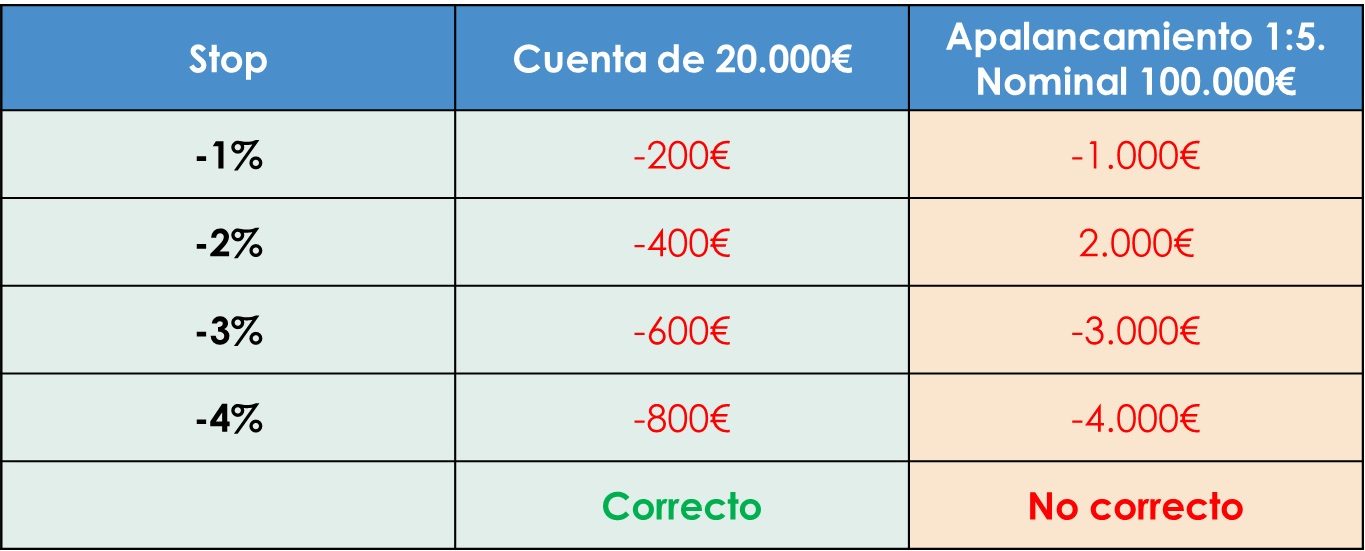 Es decir, si tienes 20.000€ y abres una trade por valor de 100.000€, el 2% de Stop deberían ser 400€ (sobre 20.000€, no sobre los 100.000€ de la posición)