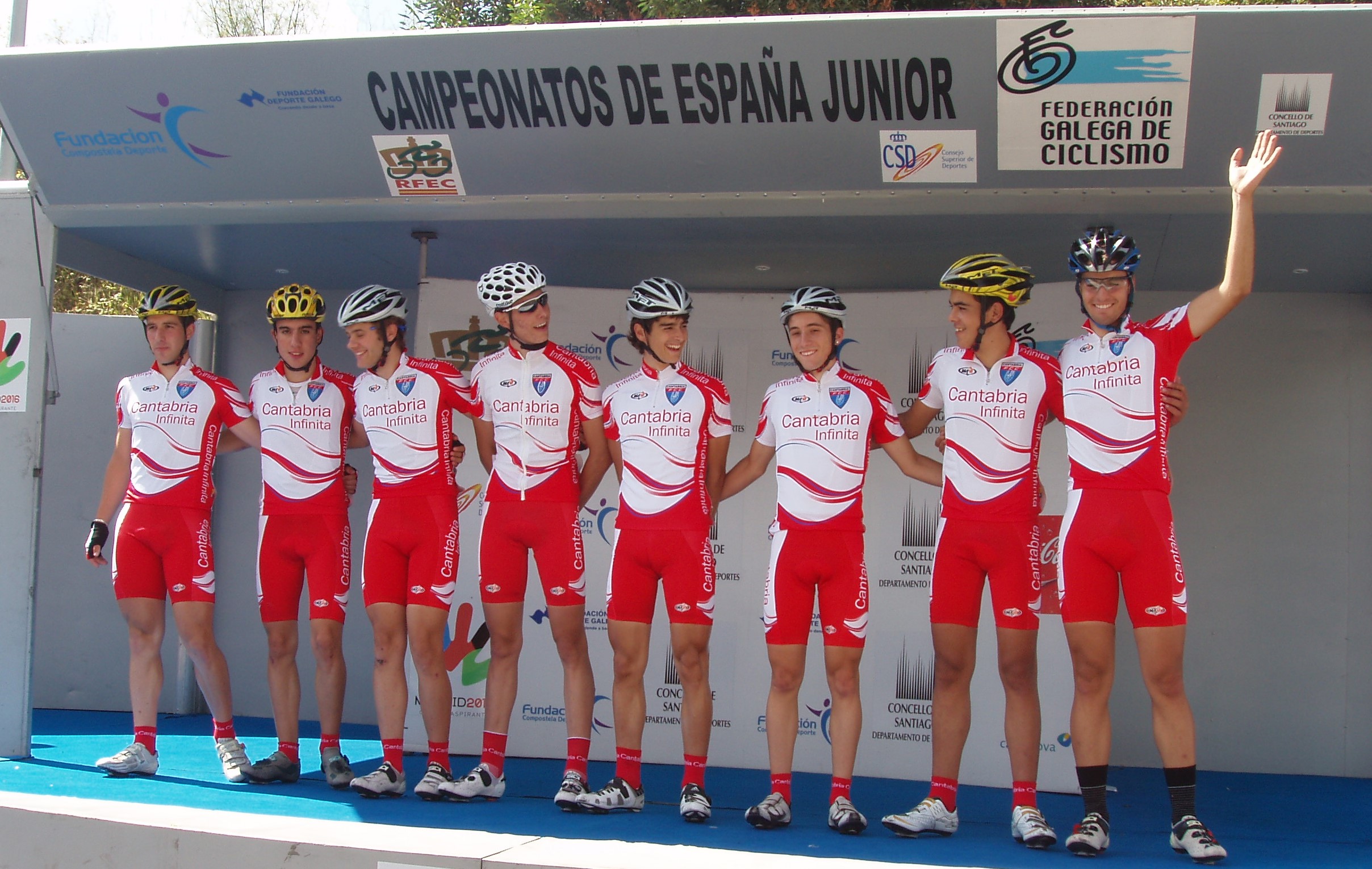 El día que Pedro Díaz Zabala me llamó para decirme que representaría a Cantabria en los campeonatos de España fue uno de los mejores días de mi vida, porque todos los sacrificios que había hecho tuvieron su recompensa en ese preciso instante. De izquierda a derecha estamos: Jesús Herrero de la Herrán (Carrejo), yo (Santander), Jose Manuel González Salas (Torrelavega), Jesús Ezquerra Muela (Treto, profesional desde 2012), Álvaro Pomar (Comillas), Daniel Becerra (Polanco), Cruz Collantes (Oreña) y Fernando San Emeterio Gandiaga (Ramales). La carrera tuvo lugar en Santiago de Compostela.