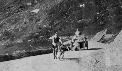 Octave Lapize fue el primer ciclista en coronar el Tourmalet en carrera. En la imagen se le aprecia caminando, los desarrollos de aquellas bicicletas no estaban preparados para escalar pendientes tan duras. Cuentan las crónicas que, en la cima del Aubisque, gritó: «¡Desgrange, sois unos asesinos! ¡En París os habéis vuelto locos!»