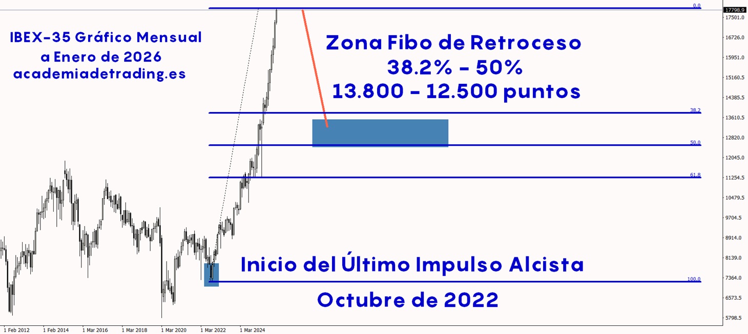 El retroceso a “Fibo” nos dice que, si el impulso alcista terminase justo donde está ahora el precio, el Ibex podría perfectamente caer unos 5.000 puntos.