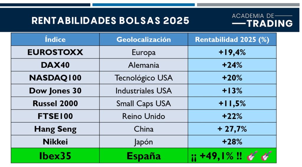 Mamma mía el Ibex en 2025. Duplicó, triplicó y hasta cuatriplicó las rentabilidades de otros índices bursátiles. Espectacular.