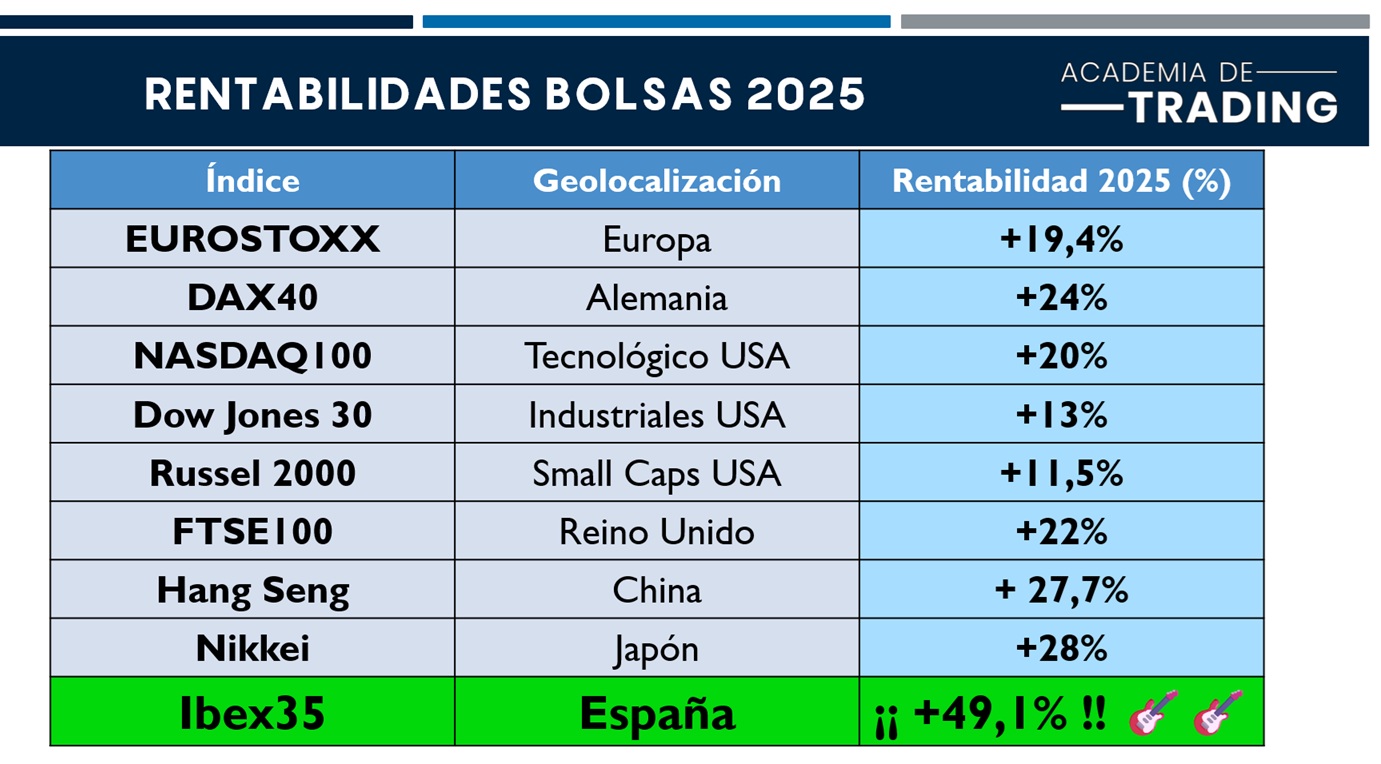 Mamma mía el Ibex en 2025. Duplicó, triplicó y hasta cuatriplicó las rentabilidades de otros índices bursátiles. Espectacular.
