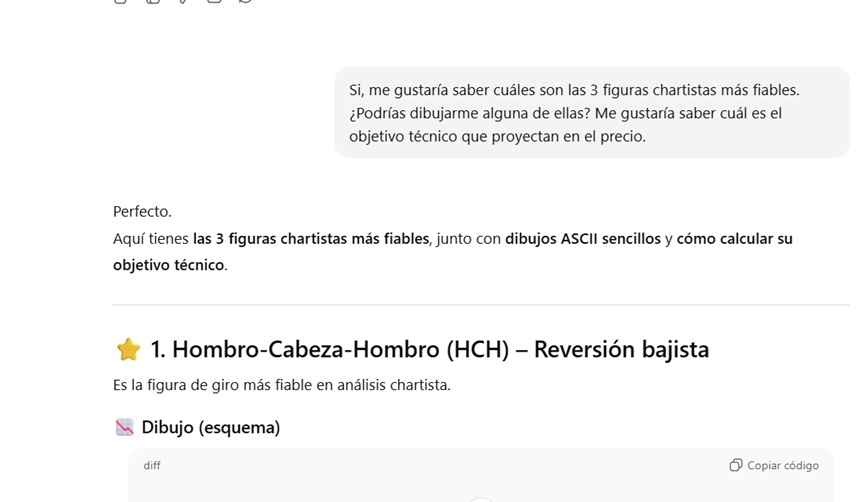 Por ejemplo, no me gustó que me dijera cuál de las tres figuras técnicas que le solicité dibujar era la más fiable. Para empezar, porque es una respuesta que variará dependiendo de cómo se formule la pregunta. No es lo mismo preguntarle qué figura técnica es más fiable para un sistema basado en seguir una tendencia, a otro que esté diseñado para aprovecharse de los rangos laterales, ¿ves por dónde va mi exposición?