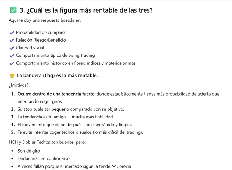 Ésta respuesta fue la que no me gustó ni un pelo, no me convenció nada que ChatGPT se pusiera a decirme qué figuras técnicas son las más fiables. Como ves, se pone a opinar sobre qué es lo más difícil del trading, menciona datos estadísticos (¿basados en qué?), y dice que «el siguiente movimiento suele ser rápido y limpio». Ninguna de las tres afirmaciones que hace son serias, no sustentarían ninguna operativa.