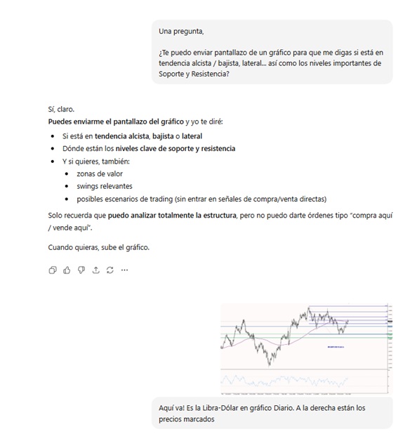 Subí a ChatGPT un pantallazo con un gráfico de la Libra-Dólar, y le pedí que lo analizara. Me sorprendió su respuesta
