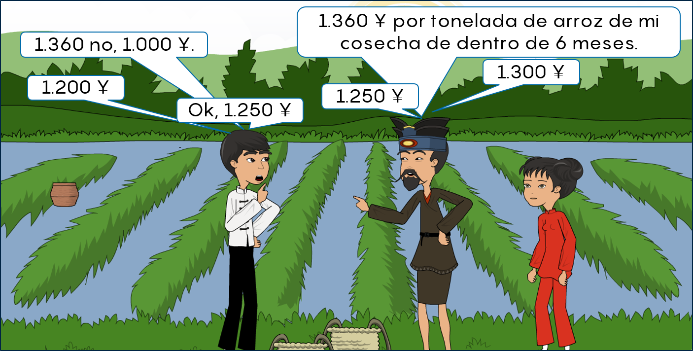 En esta viñeta escenifico la negociación del precio arroz dentro de 6 meses, cuando el productor venderá su cosecha al mayorista. Es un ejemplo de un contrato de futuros. Fuente: creación propia.