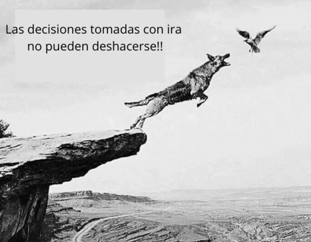 El lobo estaba cansado de que el pájaro estuviera revoloteando a su alrededor, así que se lanzó a intentar cazarle sin darse cuenta que estaba saltando a un vacío que terminaría con su vida. Podría darte más ejemplos de la vida real, pero creo que esta viñeta ejemplifica perfectamente la consecuencia de tomar decisiones impulsado por la ira. La imagen expresa más que ninguna otra palabra que yo pueda añadir