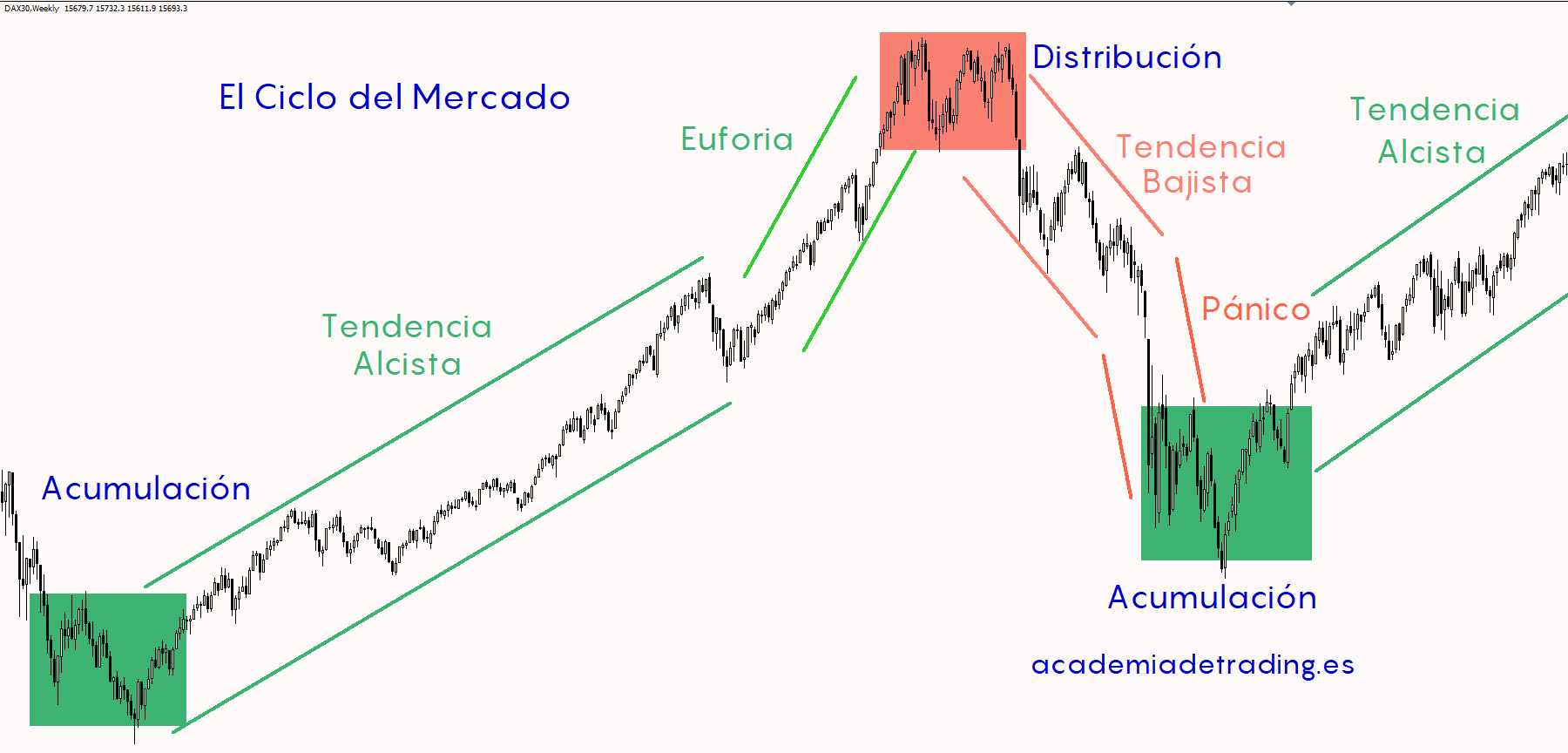 El dinero de verdad en bolsa se hace comprando en las Acumulaciones, abajo del todo; y vendiendo en las Distribuciones, cuando ya ha subido todo lo que tenía que subir. Como el ciclo del mercado siempre es exactamente el mismo, ahora verás cómo distinguir esos momentos extremos. Donde hay que darle a la tecla sí o sí.